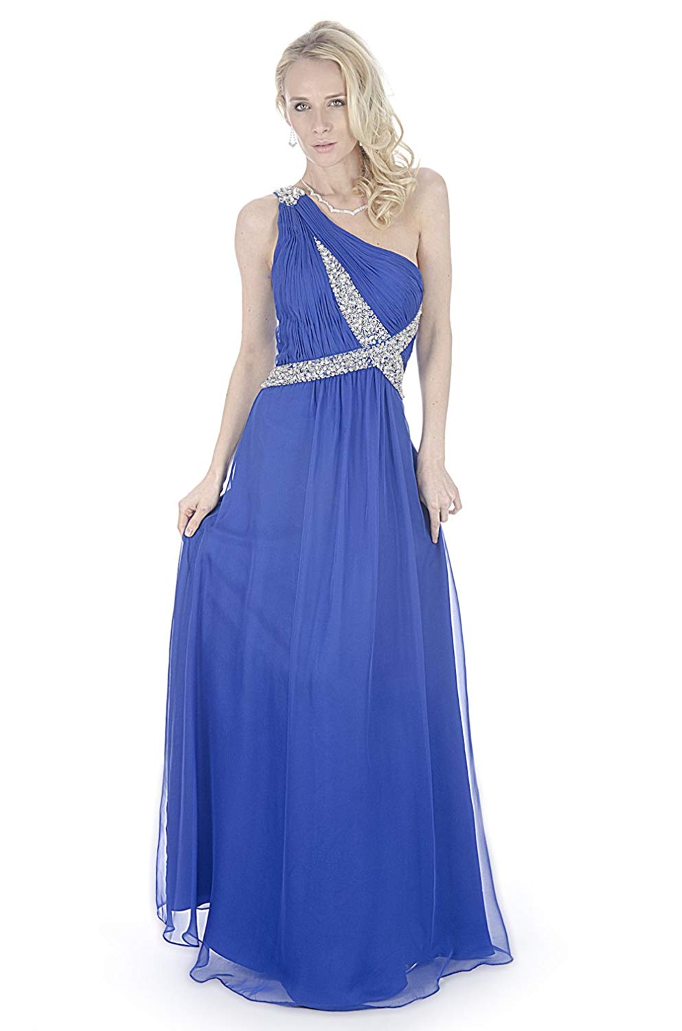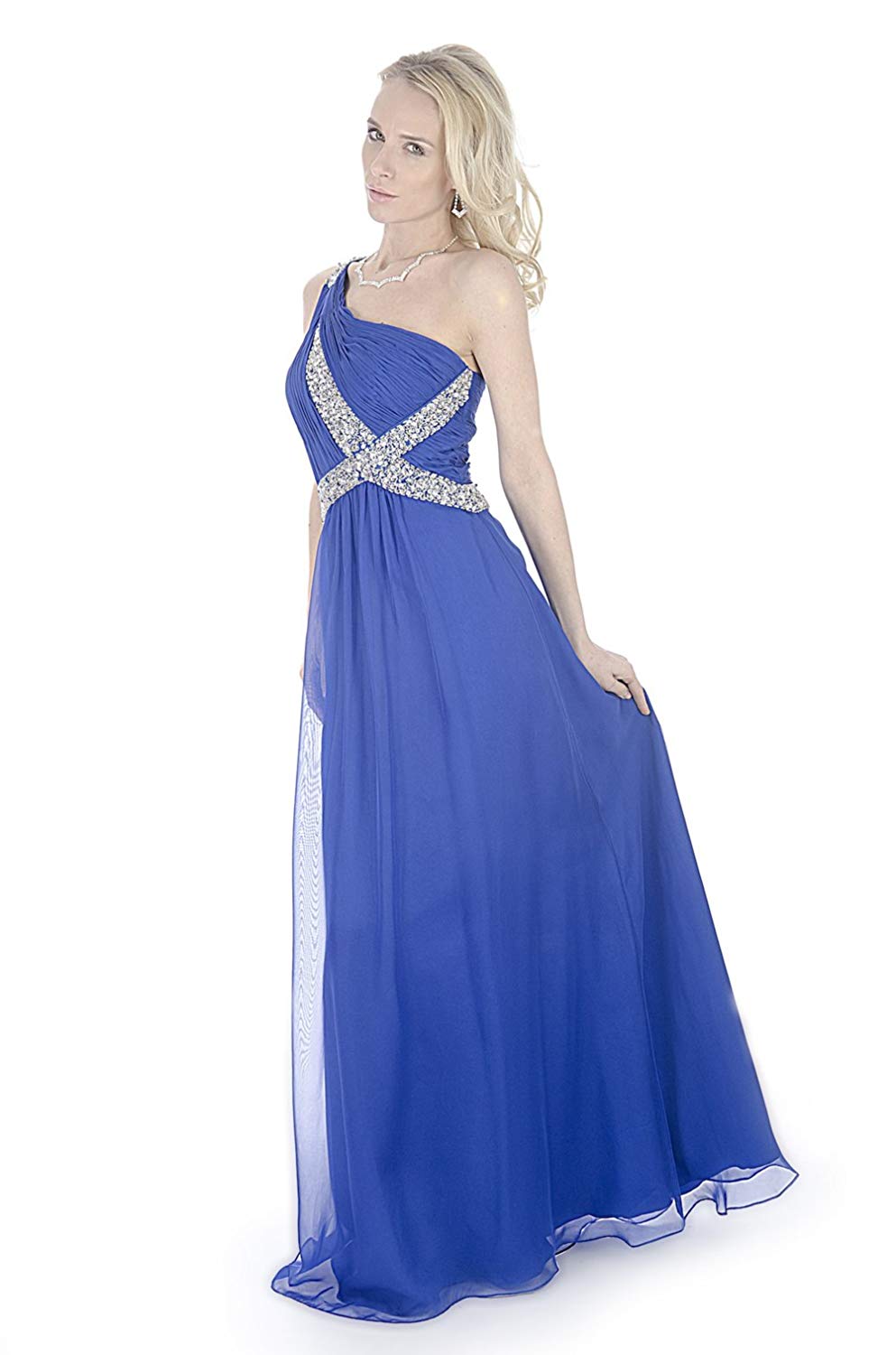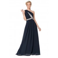 Rochie din șifon, în linie A, prinsă pe un umăr. Topul este plisat, fără decolteu, cu decorații din stras. Talia și umărul au de asemenea decorații aplicate din stras.